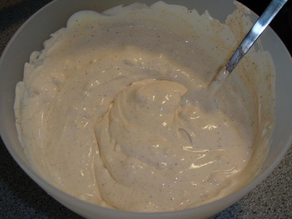 Blanda ihop creme fraich och philadelphiaosten ordentligt och smaksätt med lite paprika och chilipulver.