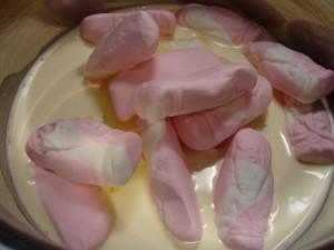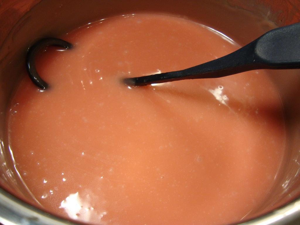 Tillsätt den vita chokladen och rör tills den smält och massan blivit blank. Tillsätt några droppar karamellfärg tills du fått önskad färg (det behövs inte användas om man inte vill, men blir lite mer rosa med det).