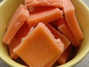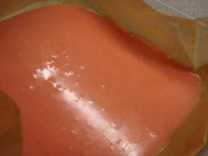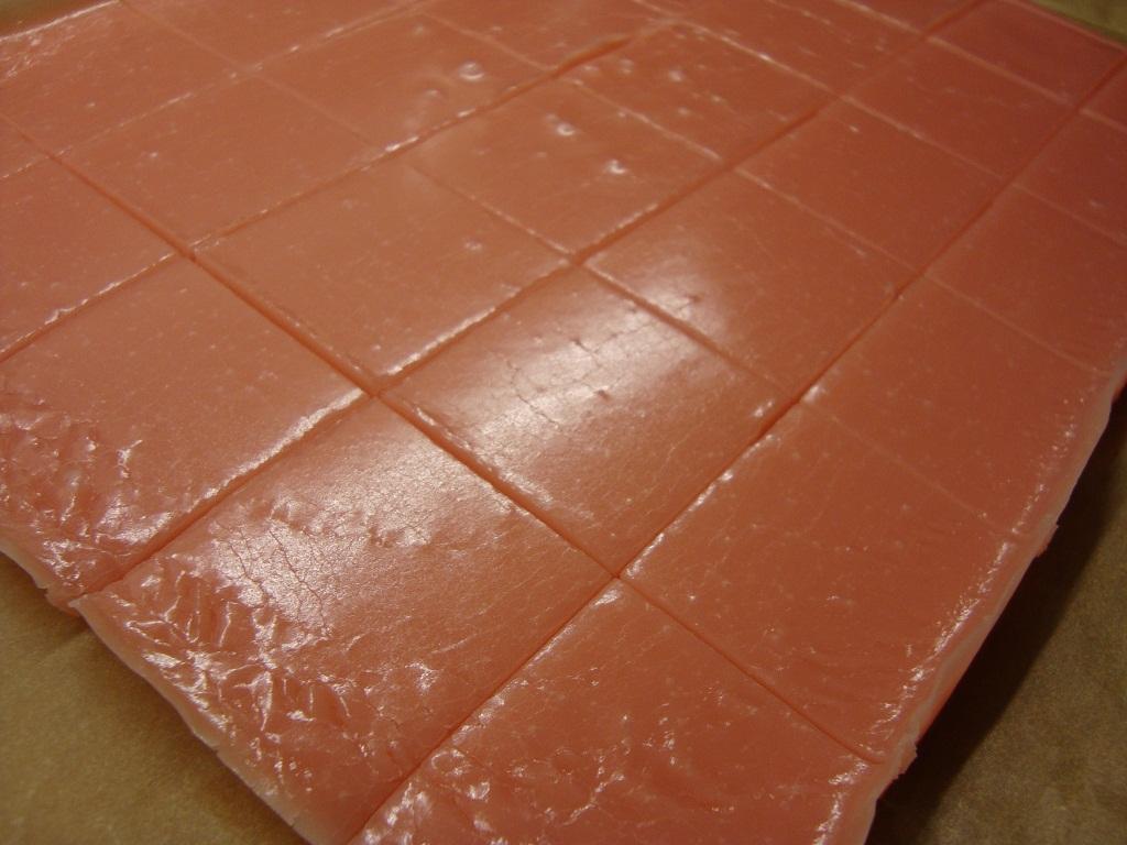 Ta av kastrullen från värmen och fortsätt röra tills massan svalnat lite. Häll upp i en bakplåtsklädd form (ju mindre form ju tjockare bitar) och låt stelna i kylen.