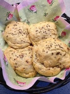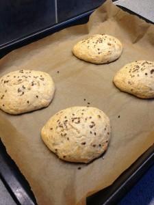 Blanda mjölet med bakpulvret och tillsätt därefter övriga ingredienser. Rör väl, klicka ut till 4 bullar. Strö på linfrö. Grädda på 225 grader i ca 10 minuter.