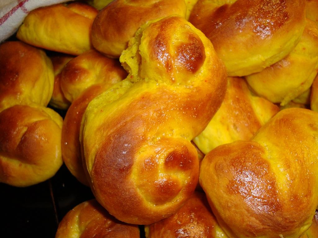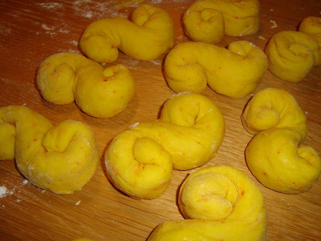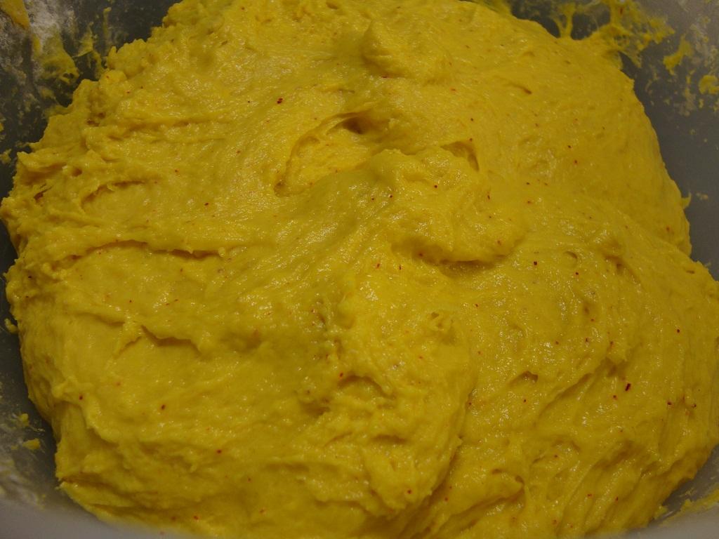 Tillsätt resten av degspadet, kesella, ägg, saffran, socker och salt. Arbeta därefter med maskin eller för hand in det mesta av mjölet så att degen släpper bunkens kanter och är smidig. Täck bunken med en bakhandduk och låt jäsa ca 30 min eller till dubbel storlek.