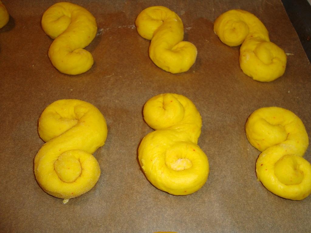 Ta upp degen på en lätt mjölad arbetsbänk. Knåda den slät och blank. Dela den i 5 delar. Baka sedan ut 10 lussekatter av varje del, genom att rulla ut varje liten del till ca 20 cm och därefter forma till en lussekatt.