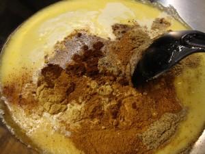 Häll blandningen i en bunke eller i en köksmaskin, tillsätt grädde och kryddor och rör om.