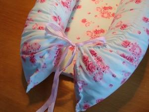 Allt eftersom bebisen växer i längden så får man öppna upp rosetten och släppa den lite så får den plats ett tag till. Man kan nog också försöka att ta ur lite vadd också om det blir allt för trångt, alternativt så gör man en ny med måtten lite större än den här så kanske man kan ha den i någon månad till.