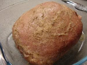 Lägg skinksteken i ugnsformen, om någon sida har mer fett än den andra, ta den feta sidan uppåt.
