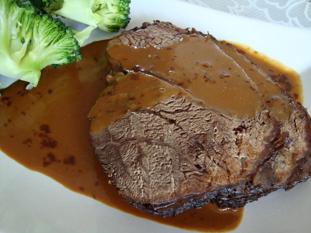 Låt sjuda totalt ca 1,5 timmar under lock på svag värme. Vänd steken en gång i halvtimmen.