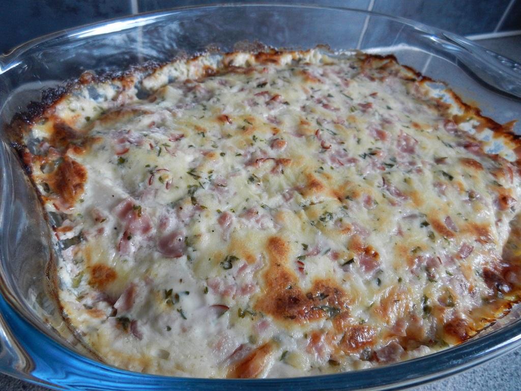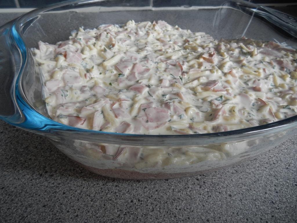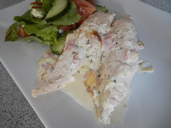 Finhacka skinkan. Blanda crème fraiche, skinka, persilja, senap och riven ost. Bred blandningen över kycklingen.