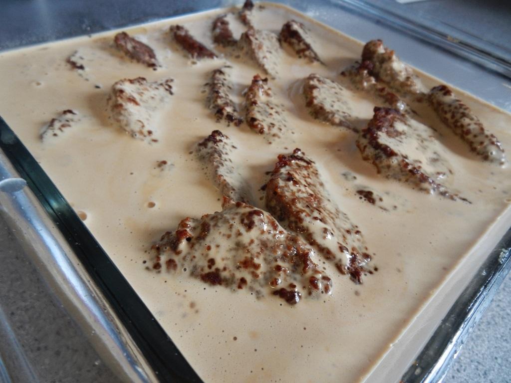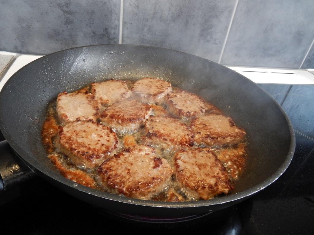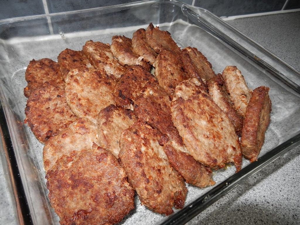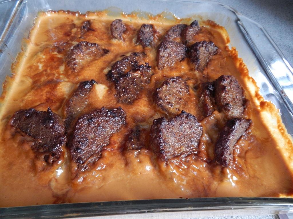 Köttet: Blanda ihop färsen med fonden och kryddorna. Forma till en lång korv och frys in med plastfolie runt. Ta fram köttkorven efter 1,5-2 timmar och skär i skivor, ca 1 cm tjocka. Stek köttet i en stekpanna och lägg sedan i en ugnssäker form.