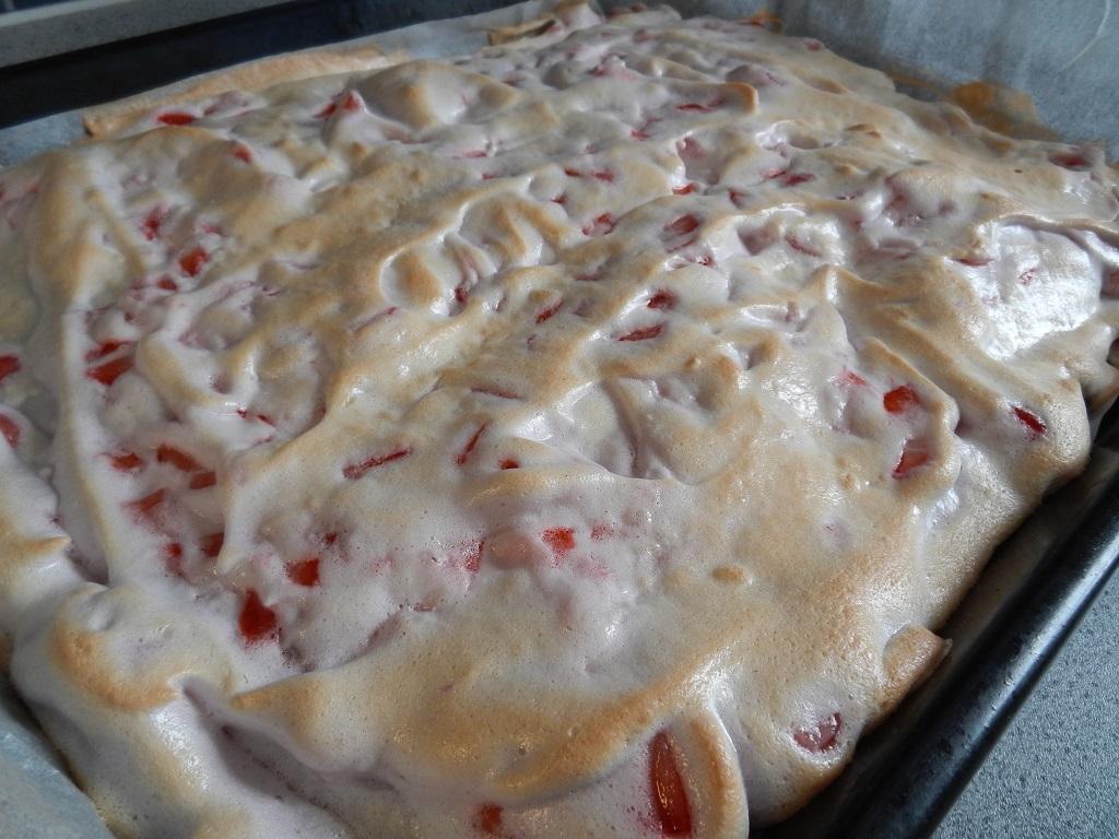 10. Ta ut kakan ur ugnen när 15 minuter gått och bred på marängtäcket. Grädda ytterligare 5-7 minuter (använder du frysta bär får du lägga på några minuter). Marängen ska börja få lite färg när den är klar. Låt kallna och skär i lagom stora bitar. Kakan går att frysa.
