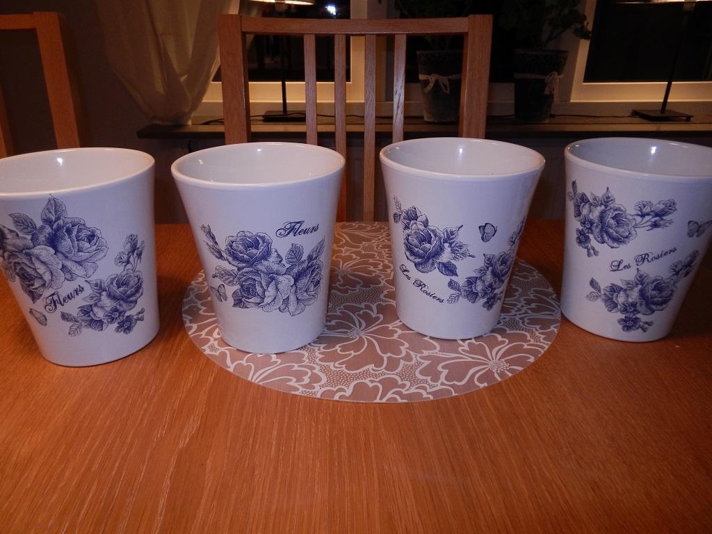 Här har jag även gjort med samma motiv som brickan men på helt vanliga vita krukor. En lätt tråkig kruka omvandlas snabbt till något personligt! Sånt jag gillar!!!