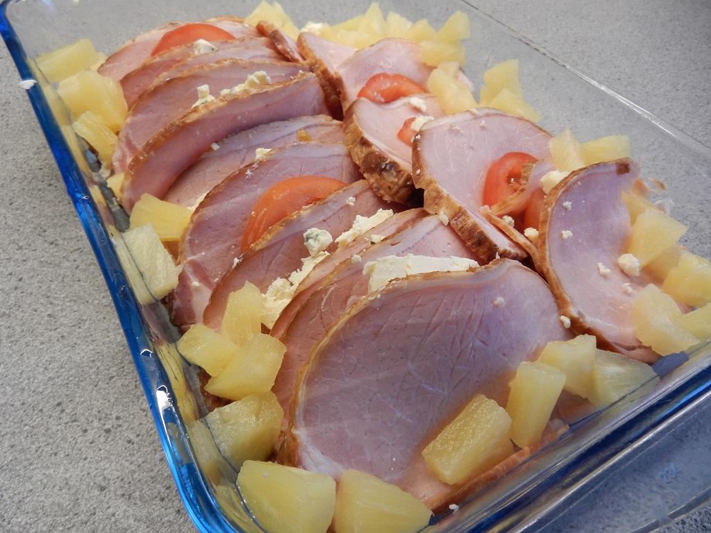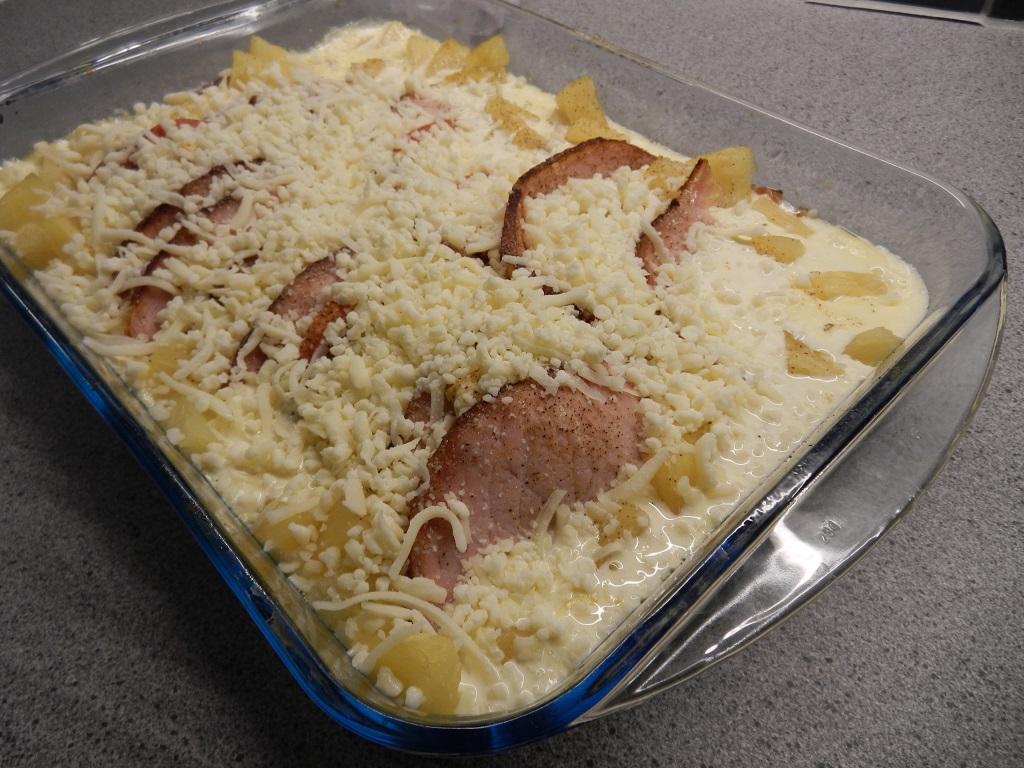 Skiva kasslern tunt och lägg i en form. Skiva tomaten och lägg en skiva ungefär mellan varannan kasslerskiva. Gör likadant med osten. Skär ananasen i bitar och lägg runt om. Häll över grädden, salta & peppra. Ställ in i ugnen, 175 C, ca 20 min.