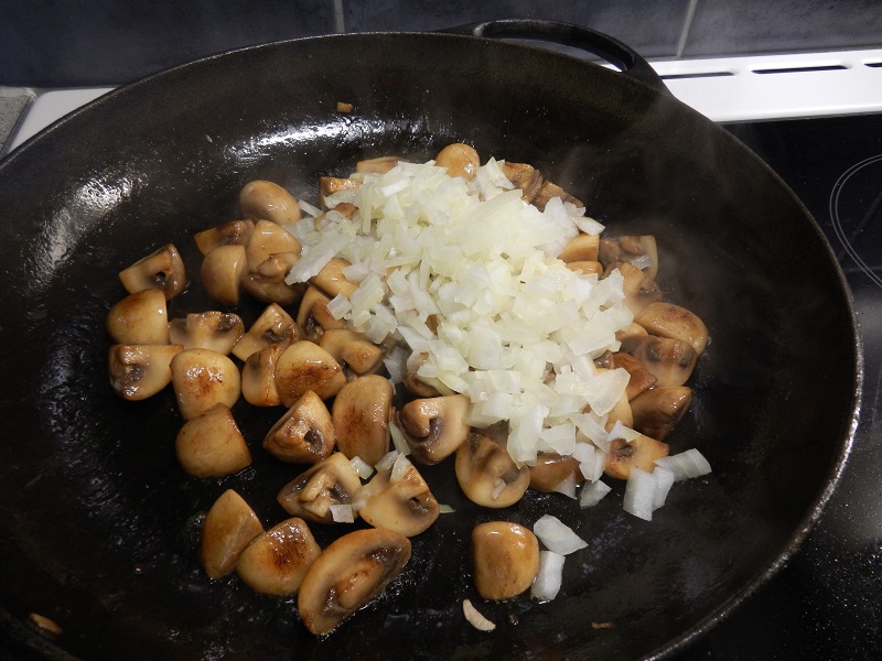 Pensla champinjonerna med en bakpensel för att få bort smuts och jord. Dela champinjonerna i 4 delar och de allra minsta på mitten. Smält smör i en stekpanna och fräs på champinjonerna på hög värme så vätskan släpper. När champinjonerna fått lite färg och krympt till halva storleken, tillsätter du finhackad gul lök och vitlök.