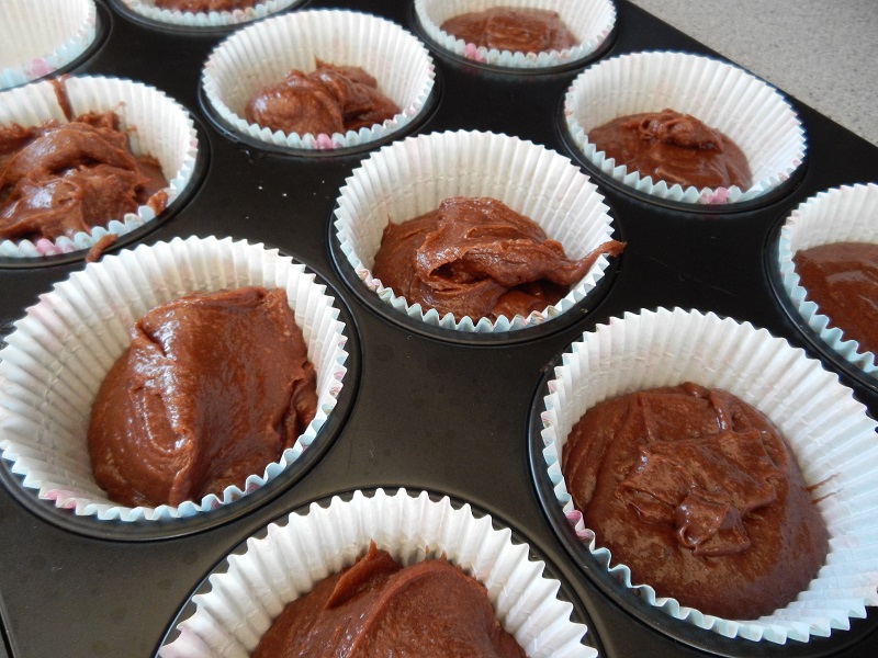 Placera ut muffinsformar i en muffinsplåt och fördela smeten mellan formarna.