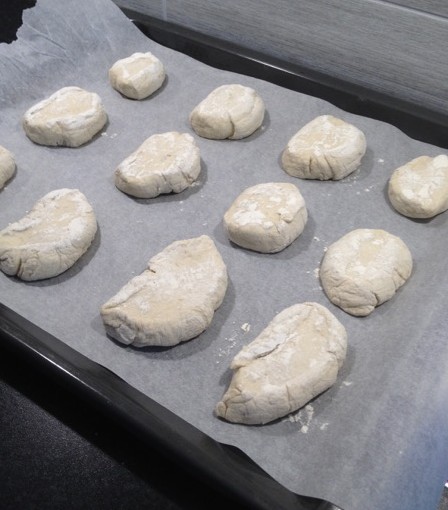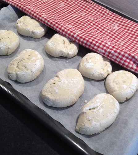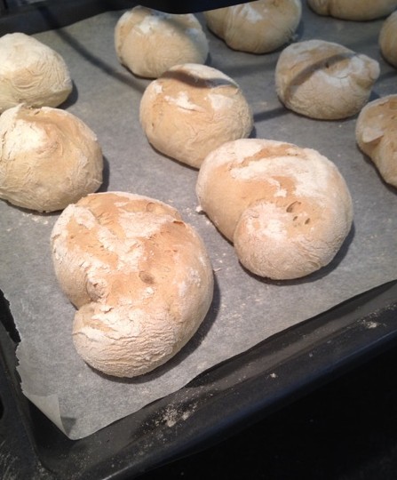 Smula ner jästen i en bunke och tillsätt lite av det ljumna vattnet och rör om väl tills jästen löst sig helt, därefter tillsätter du resten av vattnet. Häll i resten av ingredienserna och tillsätt lite mjöl i taget tills degen känns smidig och släpper bunkens kanter. Låt degen jäsa under bakduk i ca 40 min. Ta ut degen på mjölat bakbord och knåda den, dela sedan degen i fyra delar. Rulla ut varje deg och skär i 6 bitar per bit. Doppa snittytan i mjöl och lägg på en plåt med bakplåtspapper. Täck med bakhanduk och låt jäsa ytterligare ca 40 min. Grädda sedan brödet på 225 grader i mitten av ugnen i ca 10-15 min (de ska inte få för mycket färg utan vara ljusa). De bröd som man inte äter upp direkt, går som sagt utmärkt att frysa ner och ta fram vid tillfälle för att behålla färskheten.