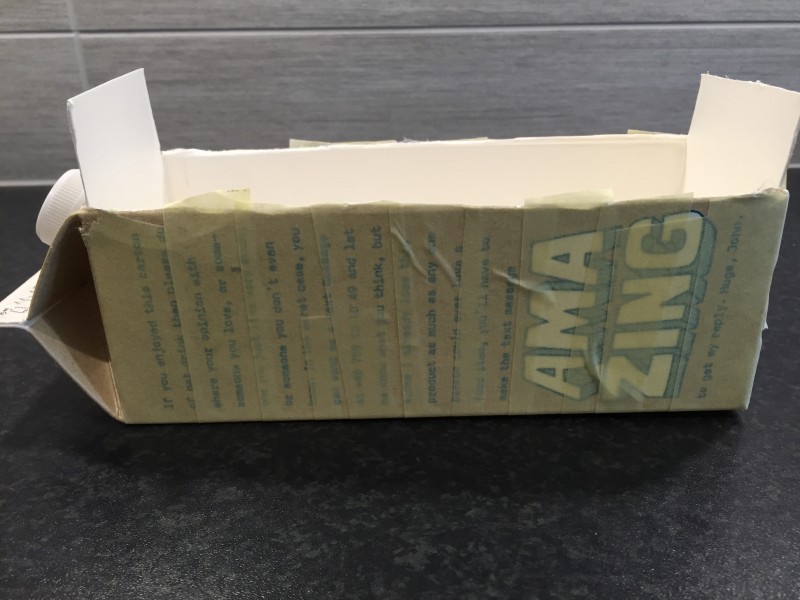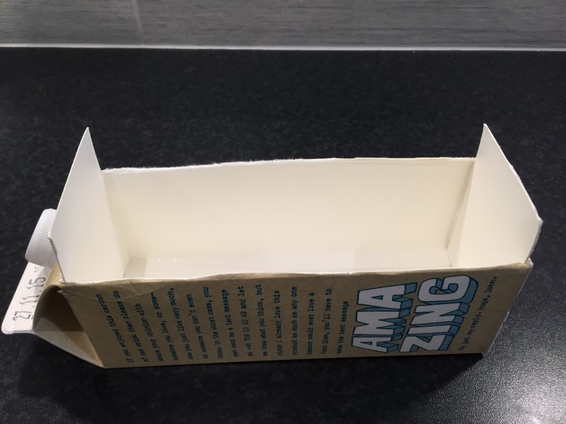 För att få till formen på min adventsljusstake så har jag använt mig av en gammal mjölkkartong. Perfekt att gjuta i. Botten och toppen på ett mjölkpaket är inte direkt raka och släta, så för att få till det så jag klippte till den bortklippta sidan till två plattor som jag tejpade fast i botten och toppen av mjölkpaketet med dubbelhäftande tejp.