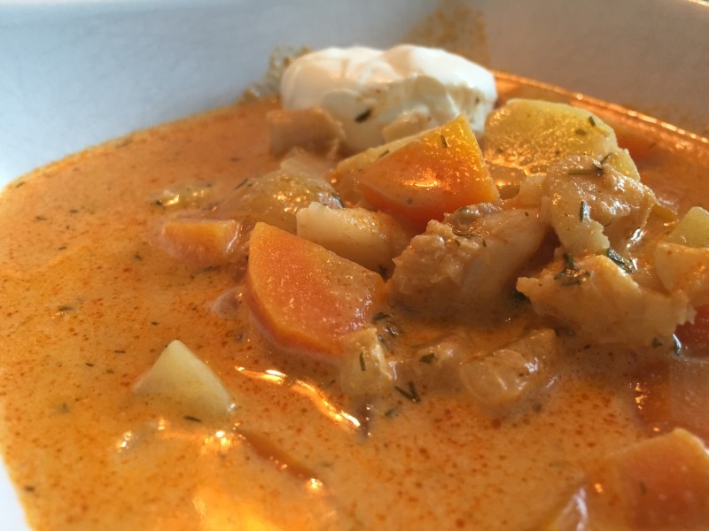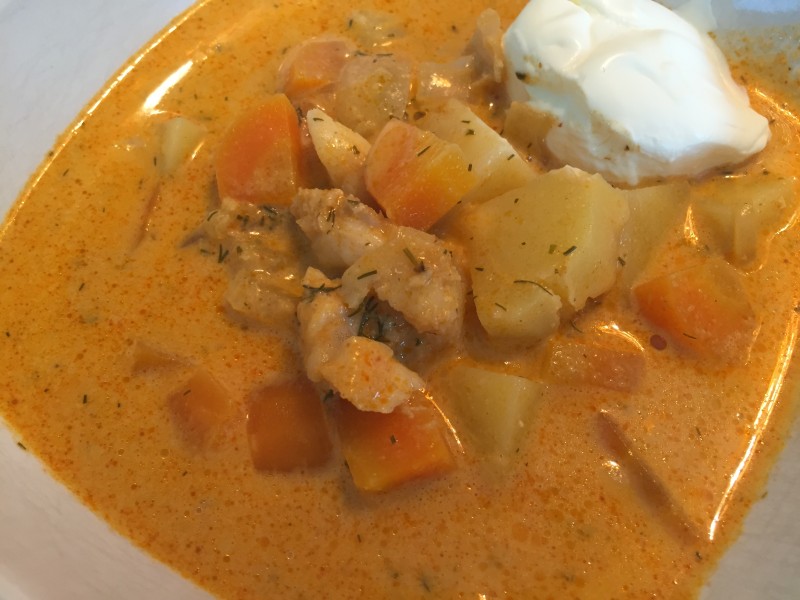 Skala och hacka lök, potatis och morötter i småbitar. Hetta sedan upp en kastrull och fräs potatis, morötter samt lök en liten stund i olja. Häll ner tomatpure, dill, hummerfond och vatten. Låt sjuda upp till potatisen är mjuk. Skär lagom små bitar av torsken och laxen (om ni inte köpt fördiga kuber som jag) vänd ner i kastrullen och låt sjuda i 5- 7 minunter eller tills fisken är genomkokt. Smaka av med lite salt, fiskkrydda och lite cayenne. Runda av med vispgrädde och låt sjuda upp.