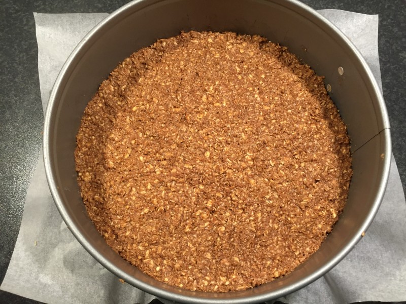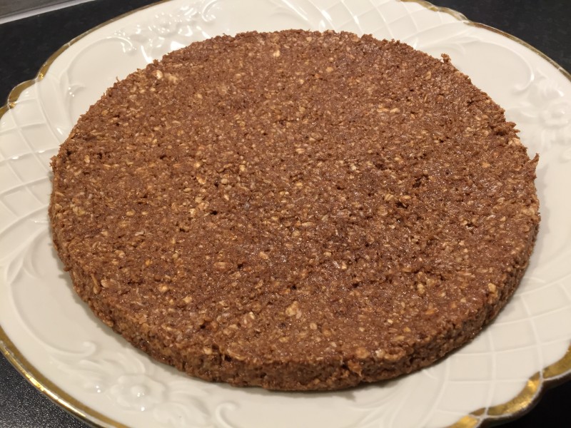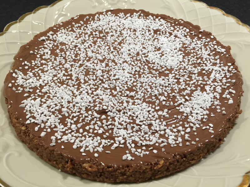 Nyp ihop havregryn med smöret och tillsätt resten av ingredienserna och arbeta ihop allt till en lite kladdig deg. Sätt fast ett bakplåtspapper i bottnen på en springform, 22–23 cm i diameter. Tryck ut chokladbollssmeten i formen. Tag bort kanten på formen och stjälp över kakan på en tallrik. Ta bort pappret och bottnen. Smält chokladen över vattenbad. Bred ut chokladen på kakan. Strö över pärlsocker eller kokosflingor och låt chokladen stelna i kylen.