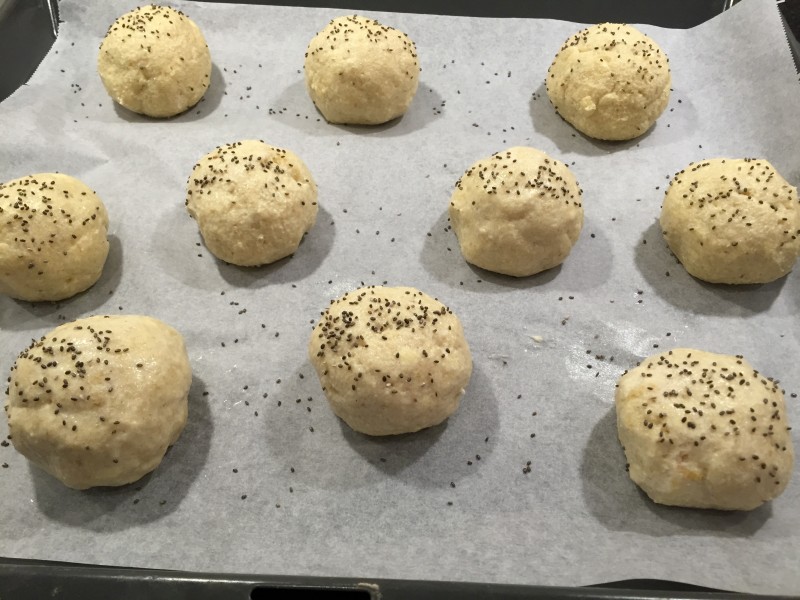 Ställ in ugnen på 175 grader. Vispa samman ägg, ”halvsmält” smör (så det lätt går att blanda ihop), yoghurt, salt och bakpulver. Häll i och blanda samman med resten av ingredienserna. Låt stå i cirka 5-10 minuter så att fiberhusk och pofiber hinner absorbera vätskan så att smeten/degen blir fast. Rulla till 6 stycken bollar. Lägg dem på ugnsplåten, strössla över vallmofrön.