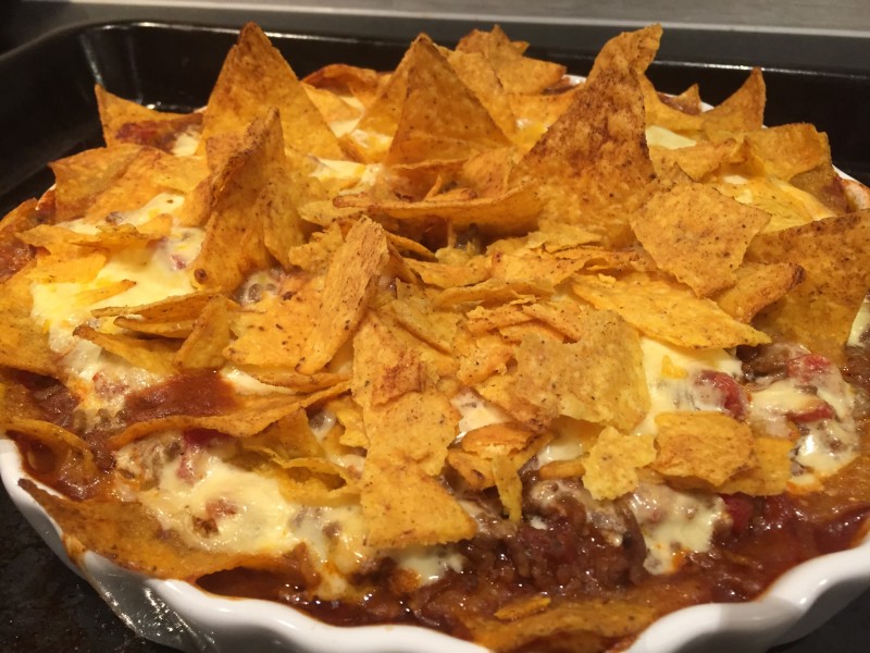 Sätt ugnen på 175 grader. Skala och hacka löken, stek den och köttfärsen i olja. Rör ner kryddmixen, vatten (enligt kryddpåsens beskrivning) och krossade tomater, låt koka ca 5 minuter. Häll upp i en ugnssäker form. Blanda osten med crème fraiche och klicka på köttfärsen. Smula tortillachipsen grovt och strö över köttfärsen. Gratinera mitt i ugnen i ca 15 minuter.