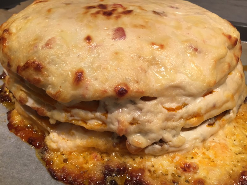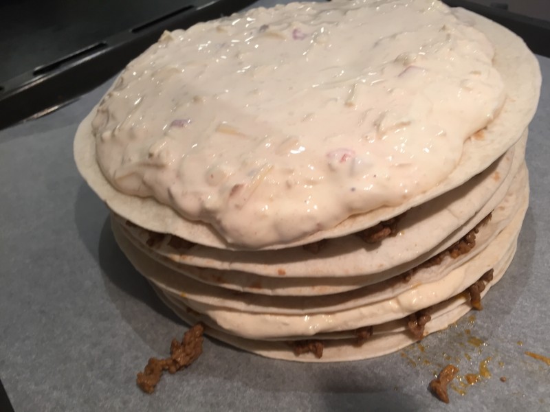 Sätt ugnen på 225 grader. Stek tacoförsen klar och tillsätt créme fraichen för att få den krämig. Ta fram en ugnsplåt och lägg bakplåtspapper i. Lägg ut ett tortillabröd i botten och häll på tacoförsen. Varva sedan tacoförsen med fyllningen vartannat så långt det räcker (jag använde fyllningen på två av bröden i mellanlagrena resten tacofärs) avsluta med fyllningen och sätt sedan in i ugnen i ca 15 min eller tills den fått fin färg.