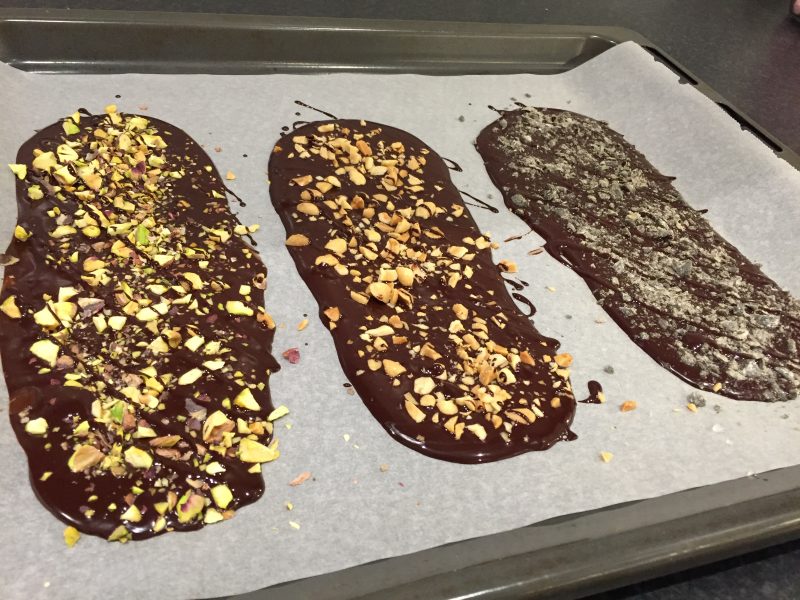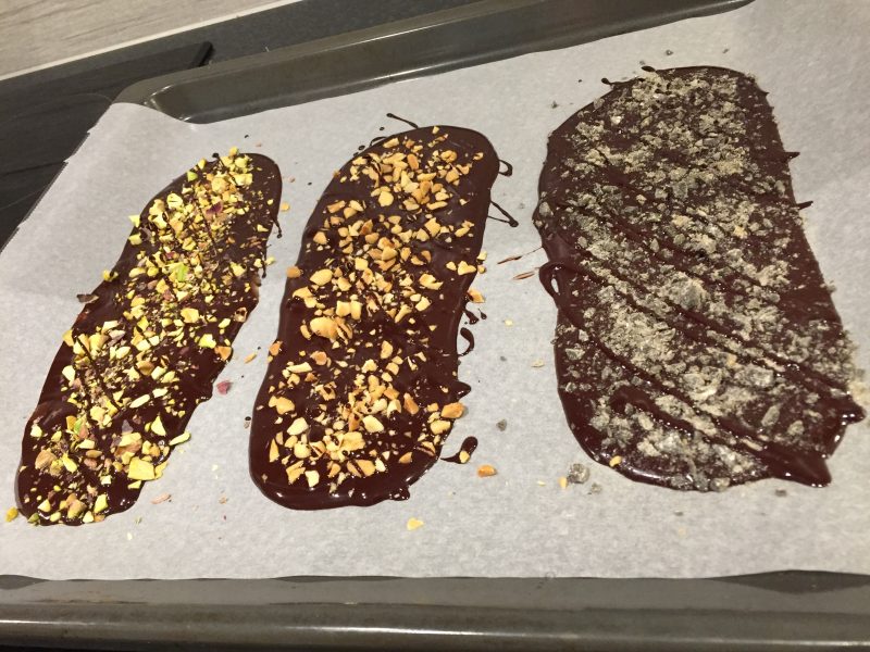 Sätt fram en plåt med bakplåtspapper och smeta ut chokladen i 3 olika längder. Häll sedan på det du önskar, i mitt fall är det vad som står beskrivet i ingrediensförteckningen.