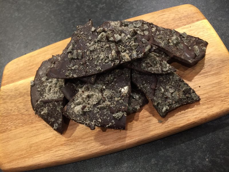 Jag tempererade chokladen för att den skulle kunna klara av att vara i rumstemperatur men även för att man inte ska bli kladdig direkt när man är i kontakt med chokladen som man annars blir med kylskåpskall choklad.