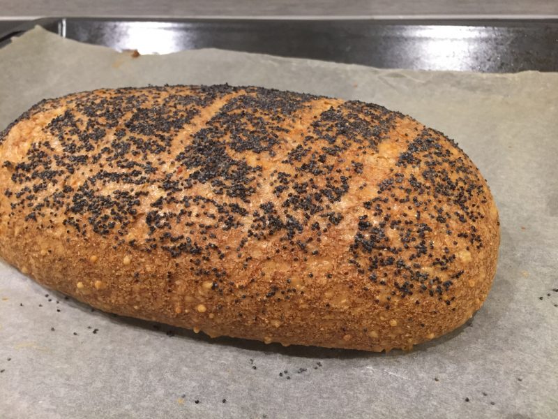 - Ställ in i ugnen och släng en deciliter vatten i botten på ugnen och stäng ugnen snabbt. Detta gör att brödet får en lite mer krispig yta. Grädda brödet i 50-60 minuter.