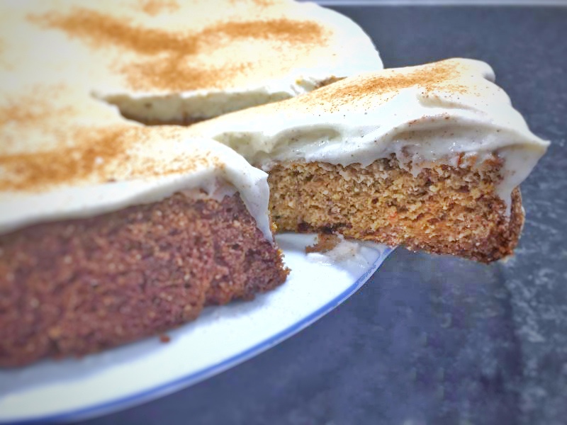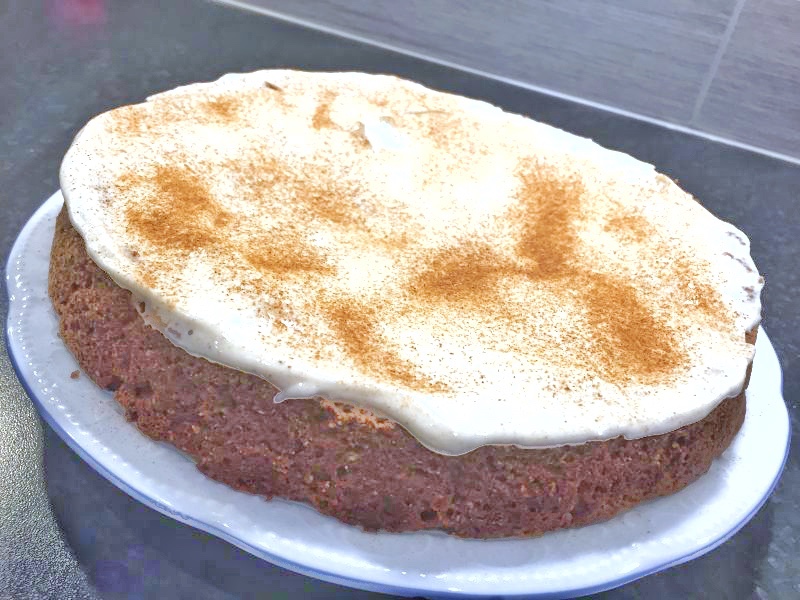 5. Tillred glasyren genom att vispa samman färskosten med sukrin och vaniljpulver. Låt stå kallt under tiden kakan svalnar. Bred sedan på glasyren över den avsvalnade kakan och strö över lite kanel – den är redo att ätas!