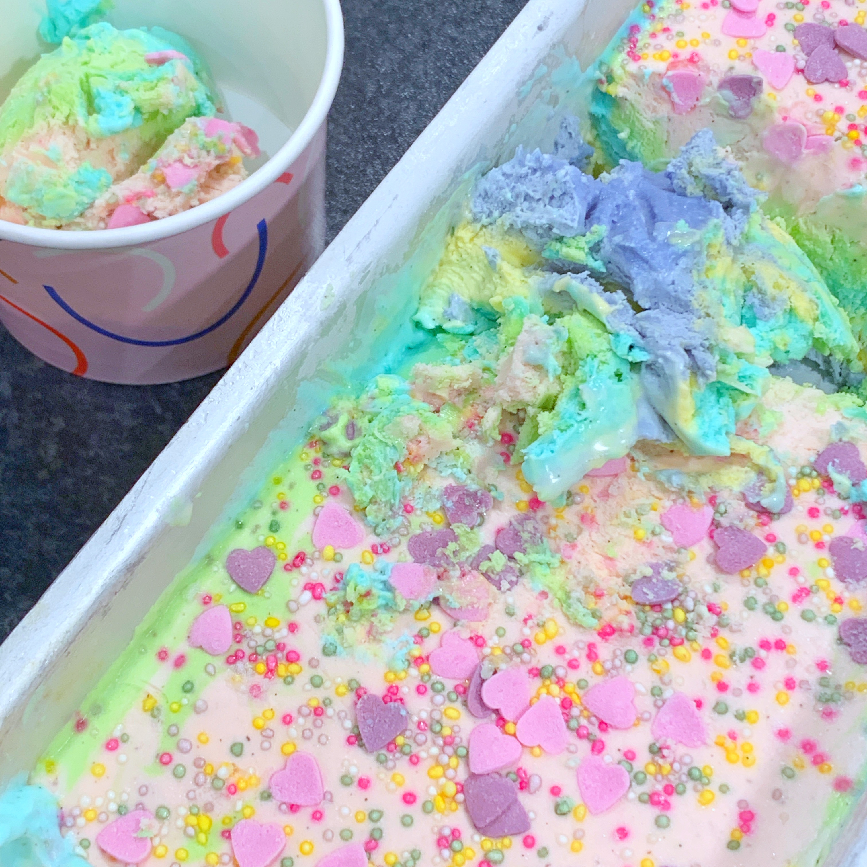 Har du barn som gillar allt med regnbågsfärger och/eller unicorns? Eller kanske du själv älskar det? Då vill jag tipsa dig om att prova den här enkla och goda glassen. Så krämig och god smak av vanilj. Bara färgerna gör att du vill smaka! Och så krävs det bara fyra ingredienser för att få till den här glassen och inget mer än en elvisp – visst är det bra?