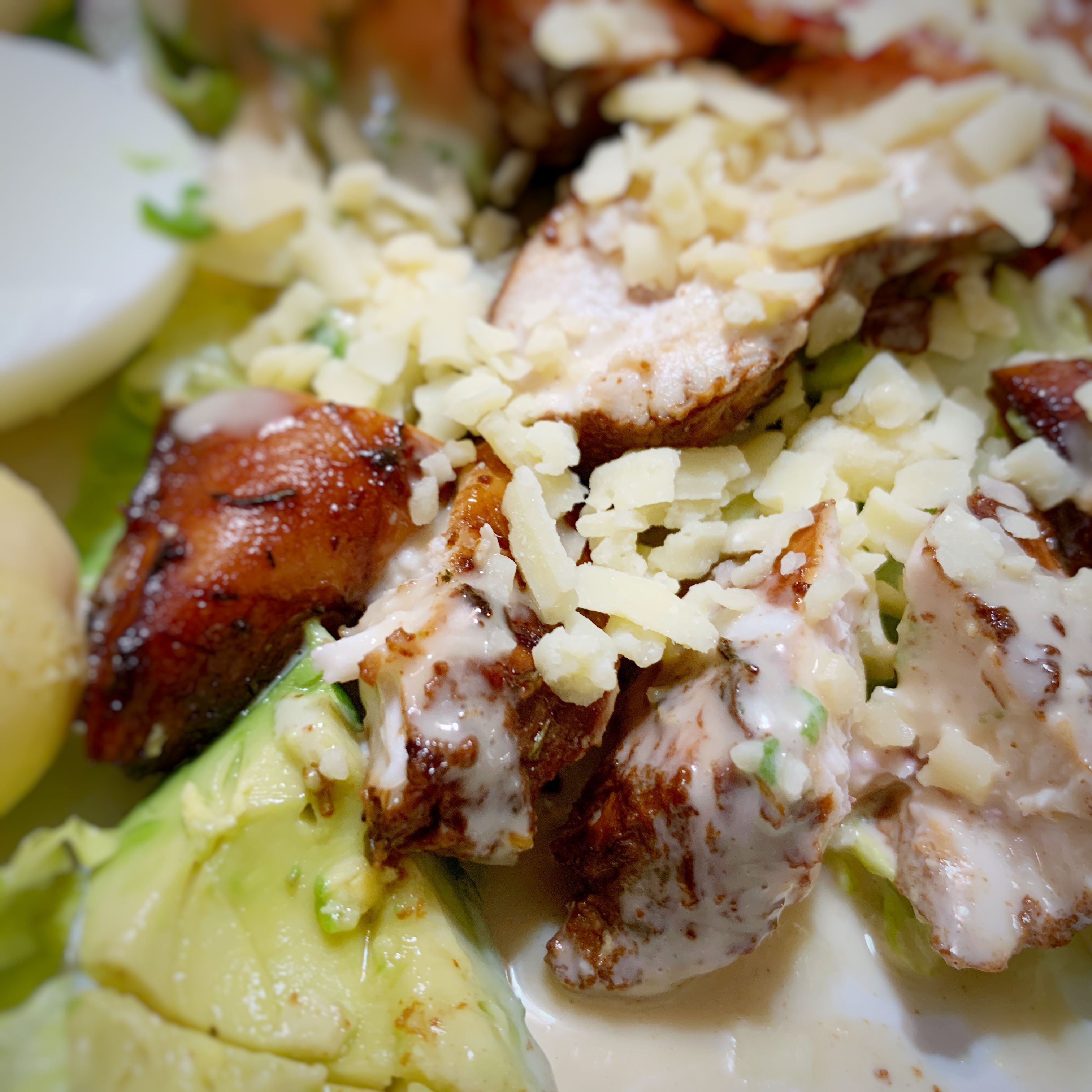 - Lägg salladen på tallriken, toppa med kyckling, bacon och grönsaker och avsluta med senapsdressingen och ägg.