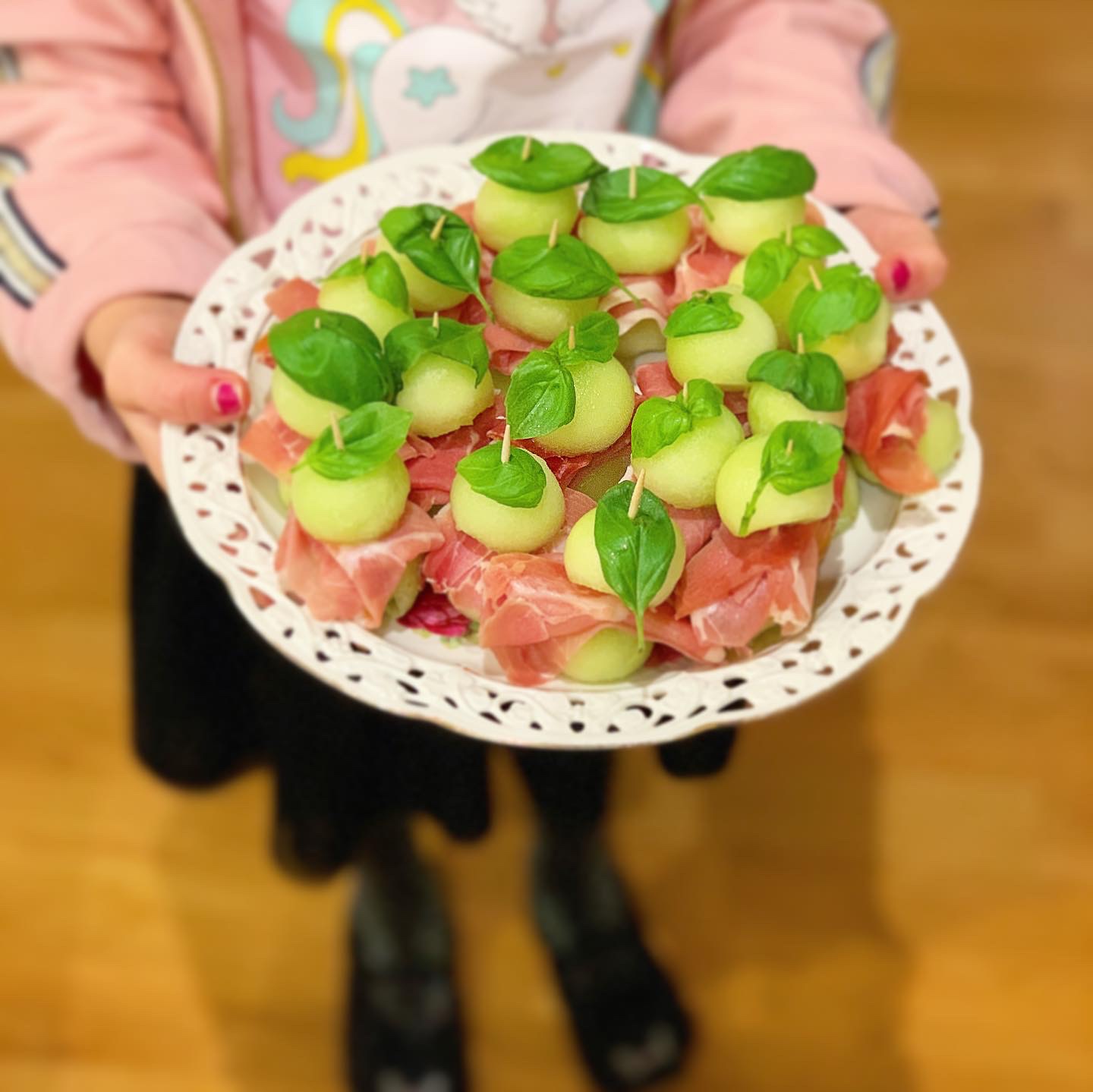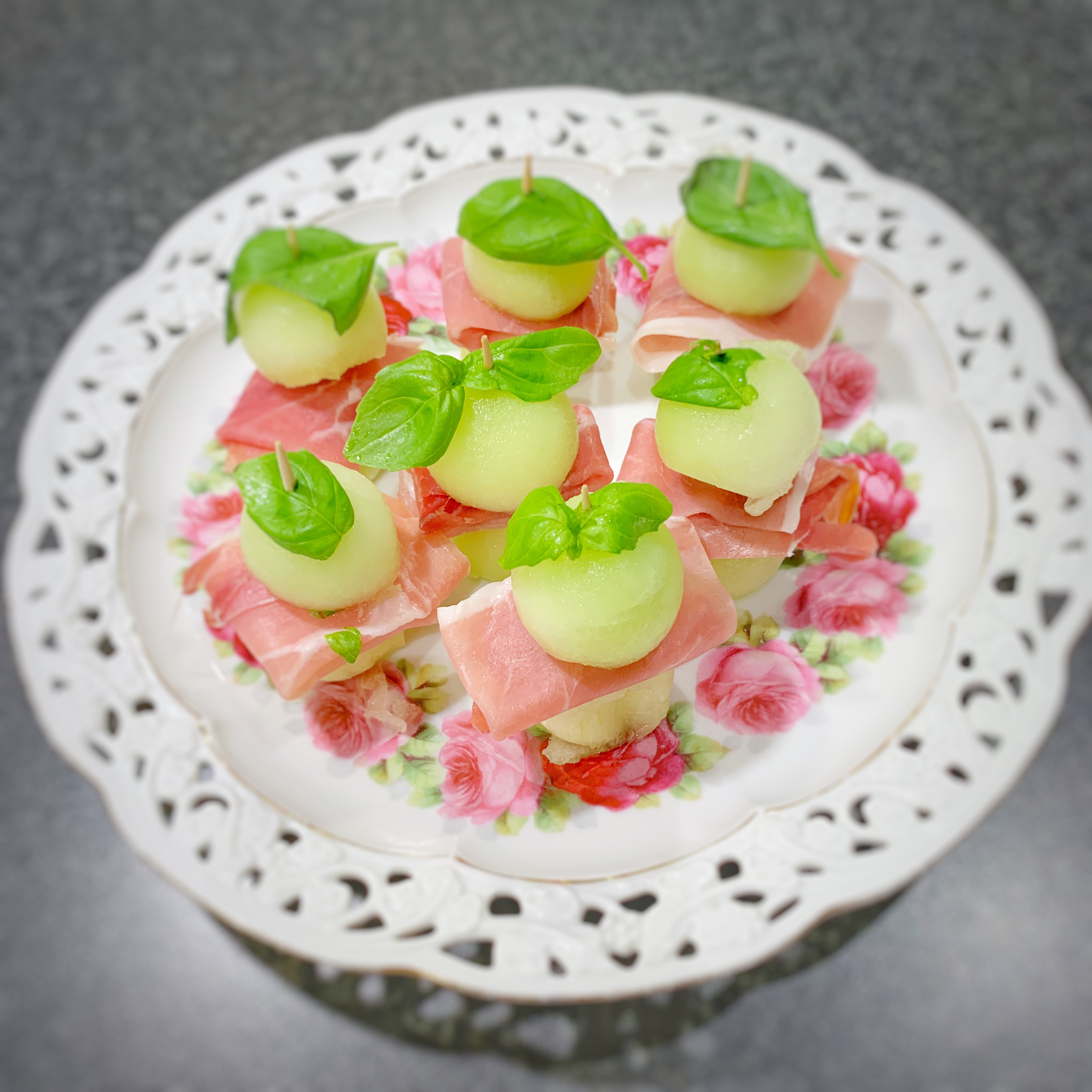 - Vik parmaskinka och trä sedan på den, fortsätt med en melonkula till och toppa med ett basilikablad.