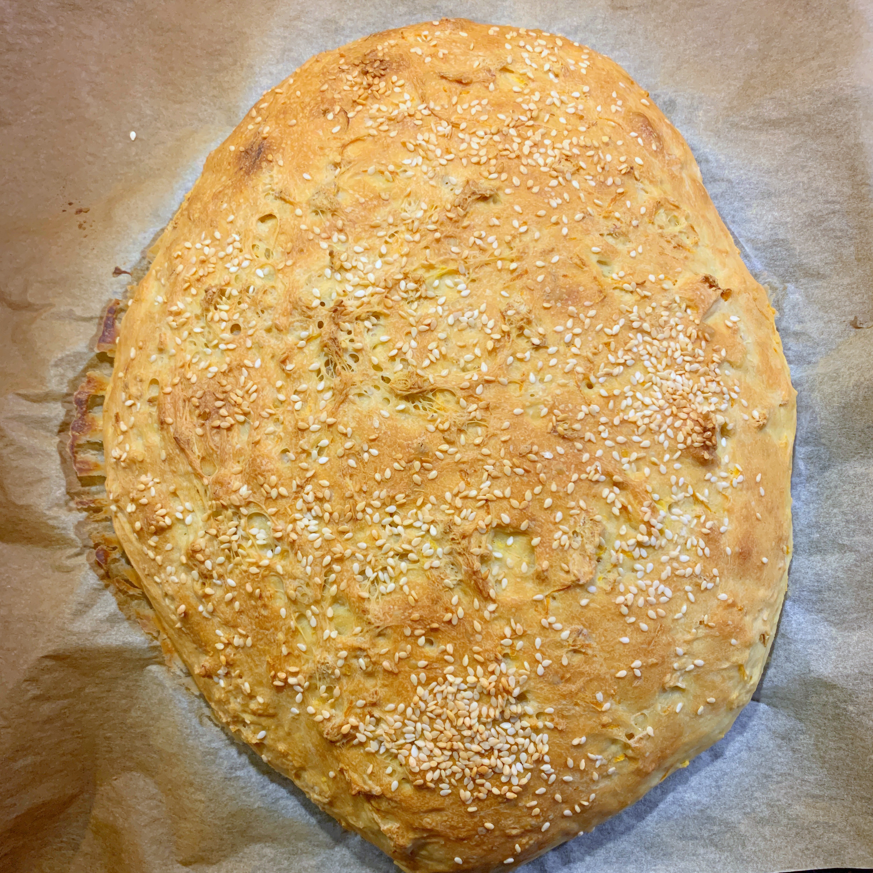 7. Häll ut den på en plåt med bakplåtspapper. Hjälp till att få ut degen med en sked eller liknande i kanterna.