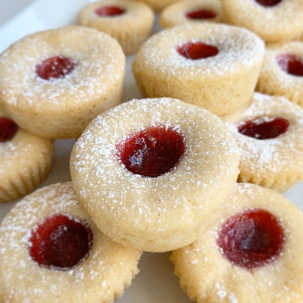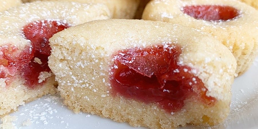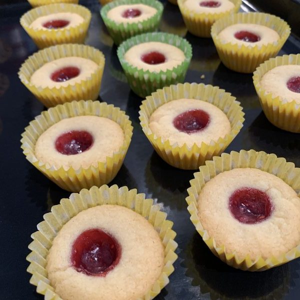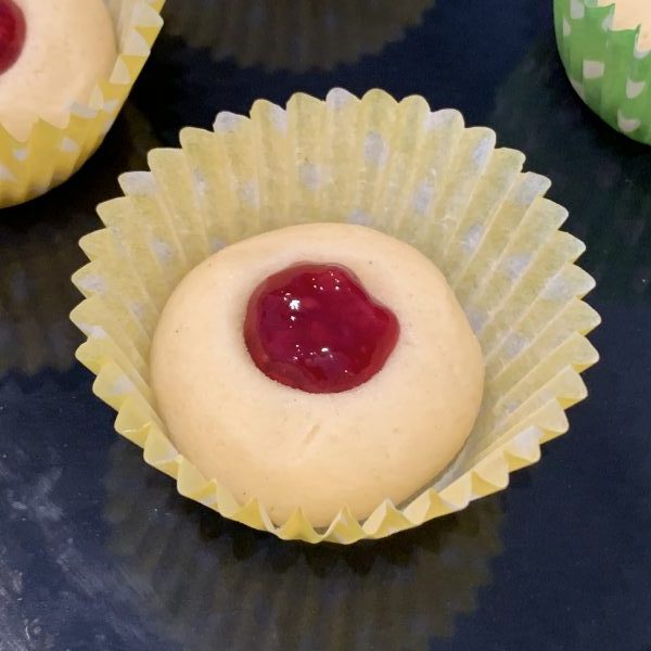 - Tryck ner tummen, eller använd skaftet på kaveln i varje degboll, så att det bildas en grop i mitten. Fyll sedan groparna med hallonsylt.