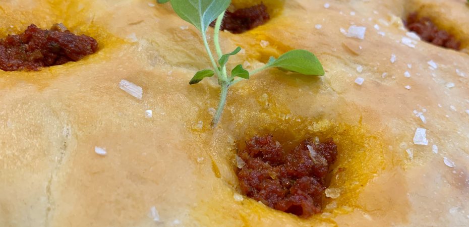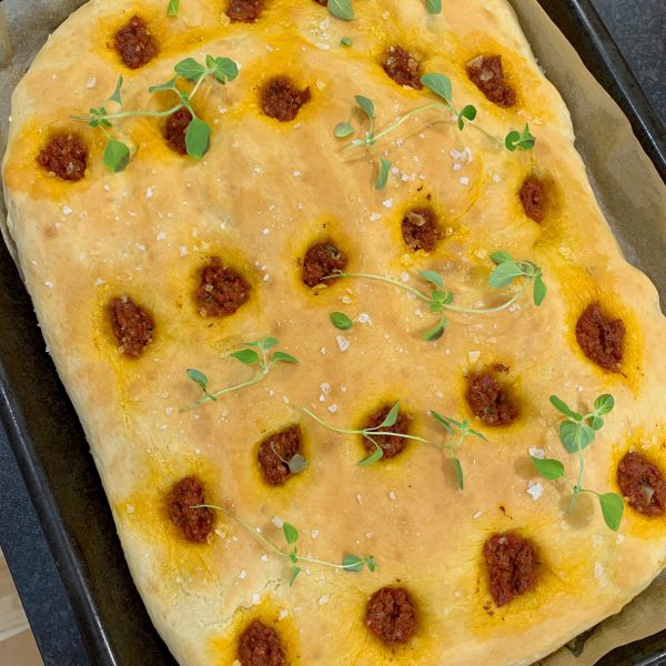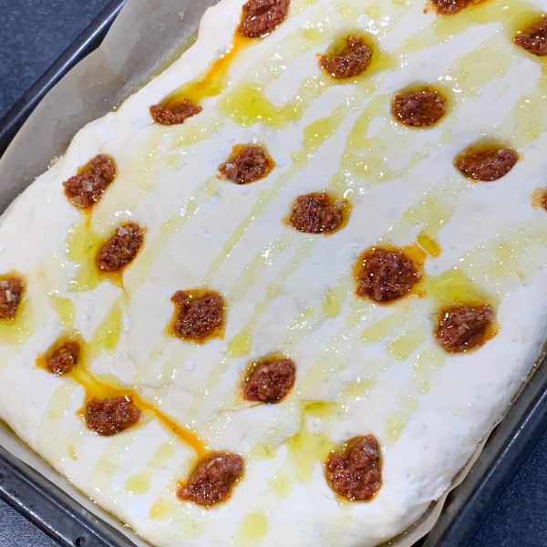 - När degen jäst klart, sätt fingrarna i degen så att det formas en massa hål, fyll hållen med tapenade och ringla över rikligt med olivolja och strö över flingsalt.
