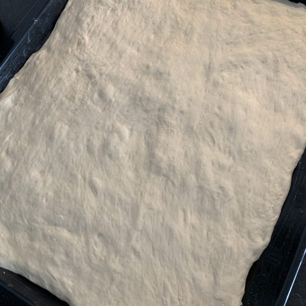 - Smörj en långpanna med smör eller olja. Tippa ur degen i långpannan som är cirka 30×40 cm och platta ut den med fingrarna så att den täcker hela botten. Använd lite mjöl på fingertopparna om det är svårt att platta ut degen.