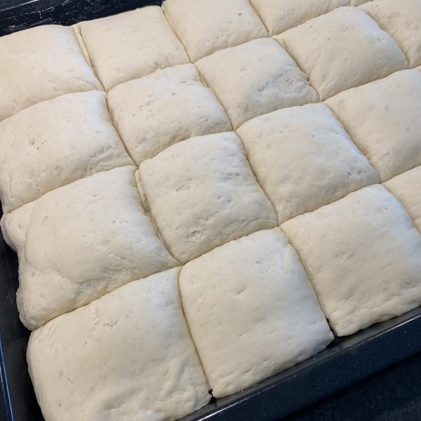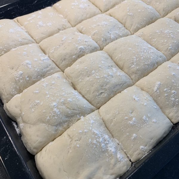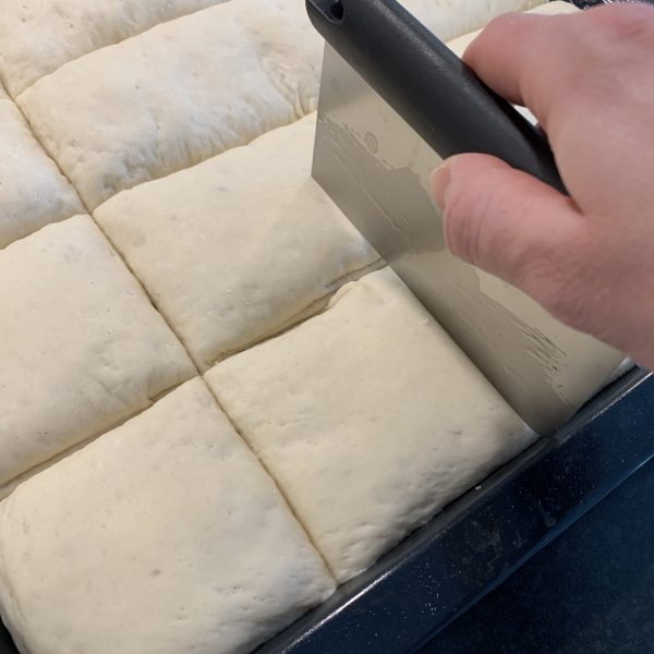 - Sätt ugnen på 225 grader. Skär degen i rutor med en degskrapa som du kan använda lite olja på så fastnar inte degen.