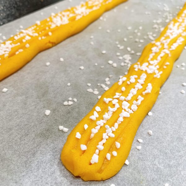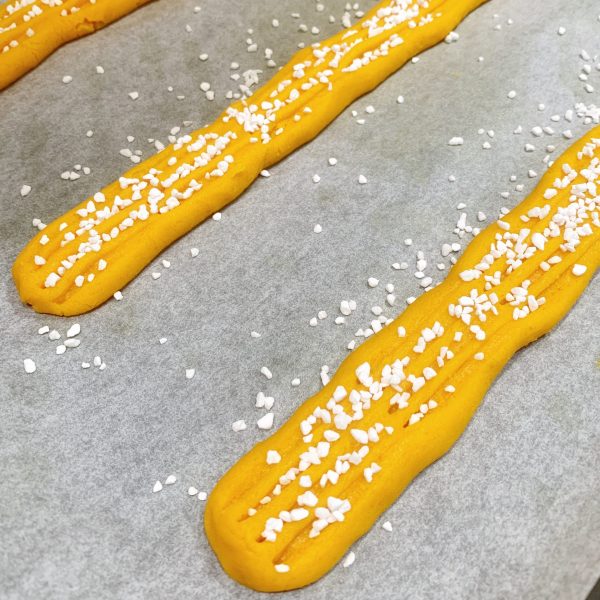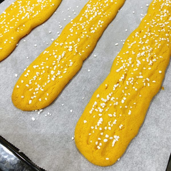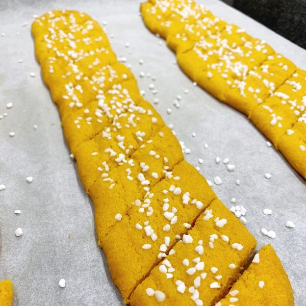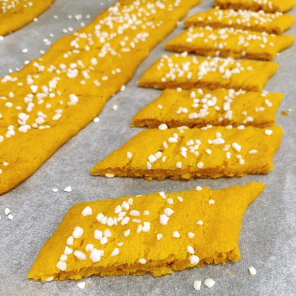 - Ta ut plåten från ugnen och skär direkt i diagonala snittar.