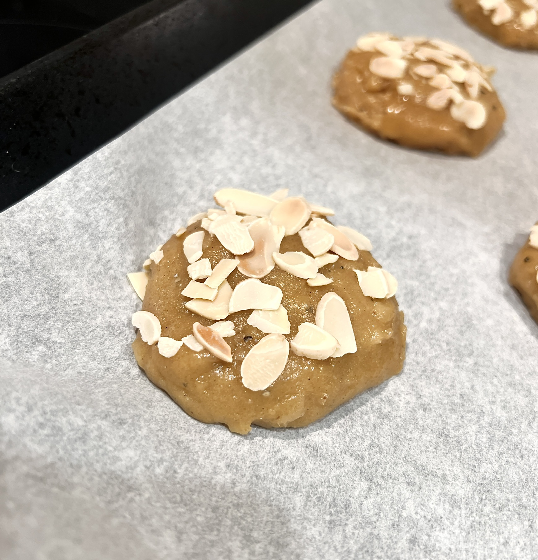 - Doppa alla bollar (ena sidan räcker) i mandelspån och lägg sen över på plåtarna med jämna mellanrum. De behöver lite space, så låt det vara max 6-7 st per plåt.