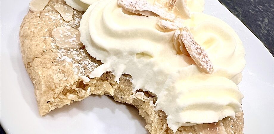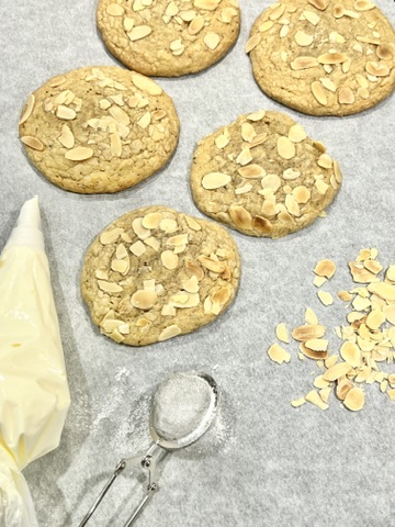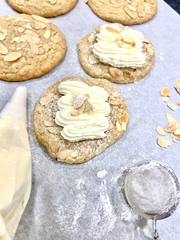 - Toppa kakorna med lättvispad grädde, smulad mandelflarn och pudra över lite florsocker.