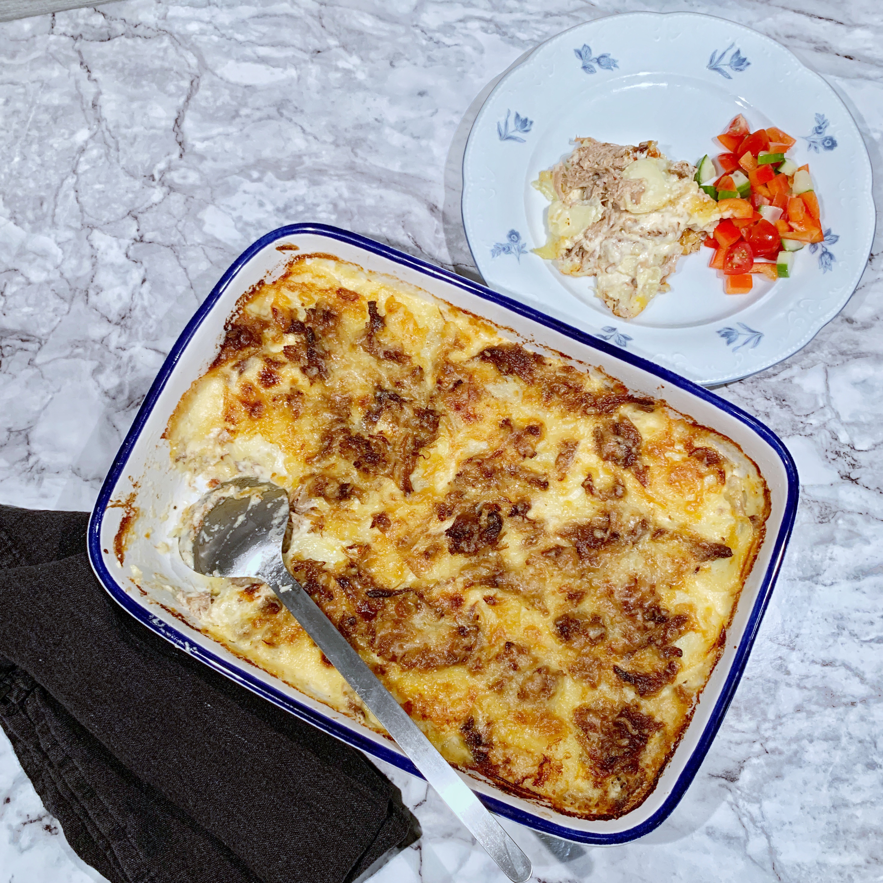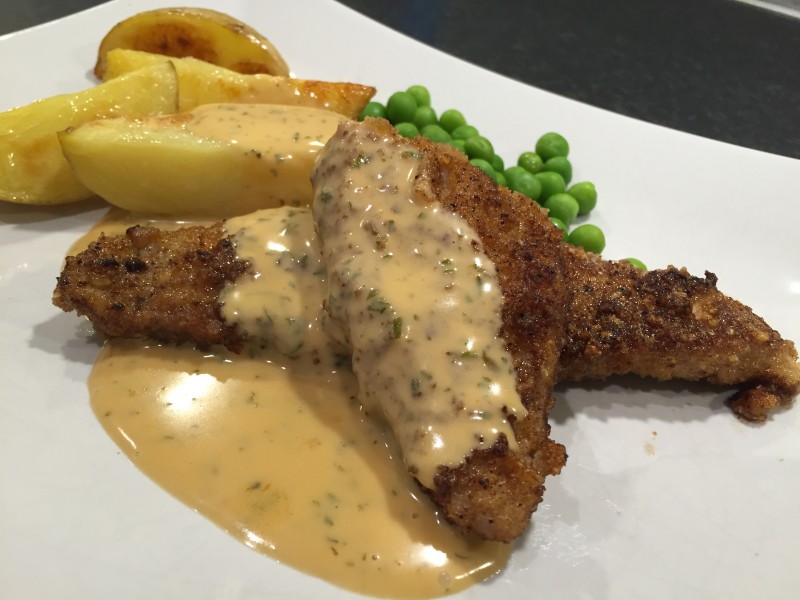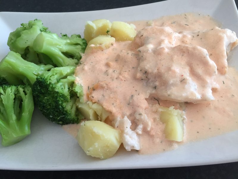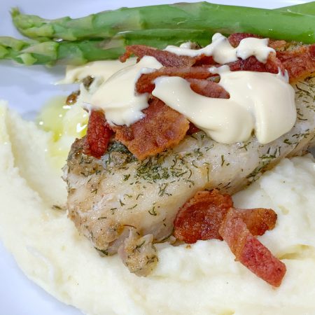 Smörstekt torskrygg med potatispuré, bacon och hollandaisesås