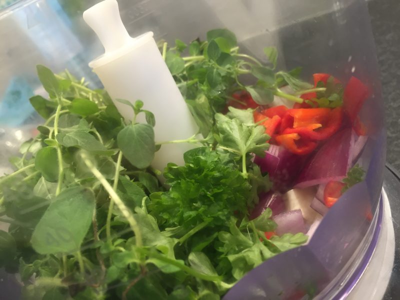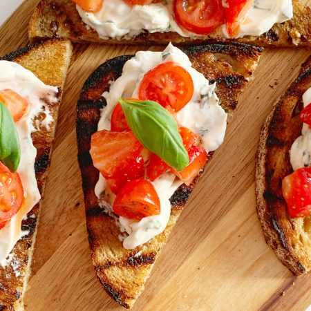 Sommarens godaste tillbehör: grillad levain med örtkräm, tomat- och jordgubbssallad